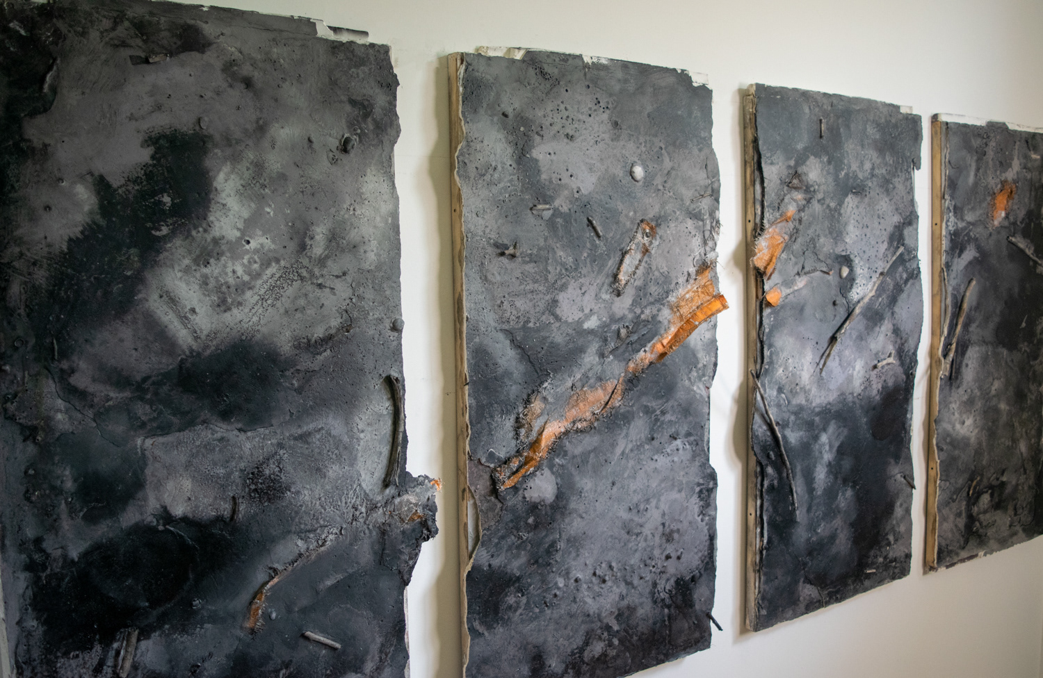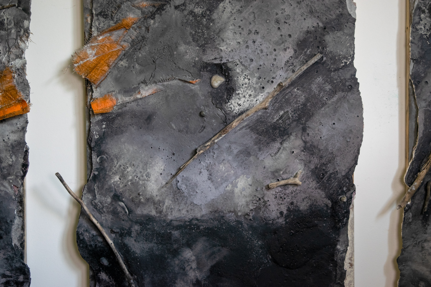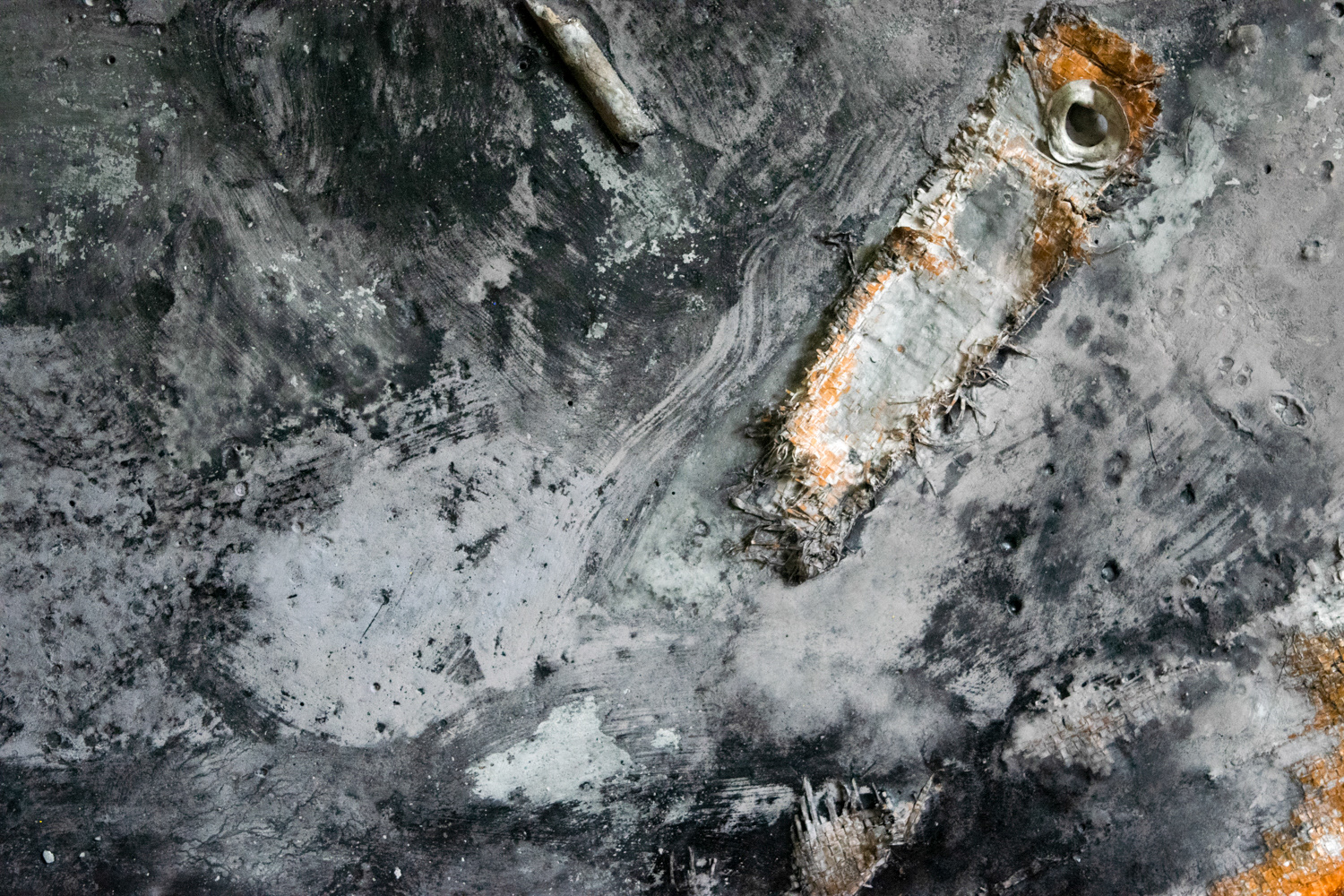 Gypsum cement, acrylic, found objects on panel